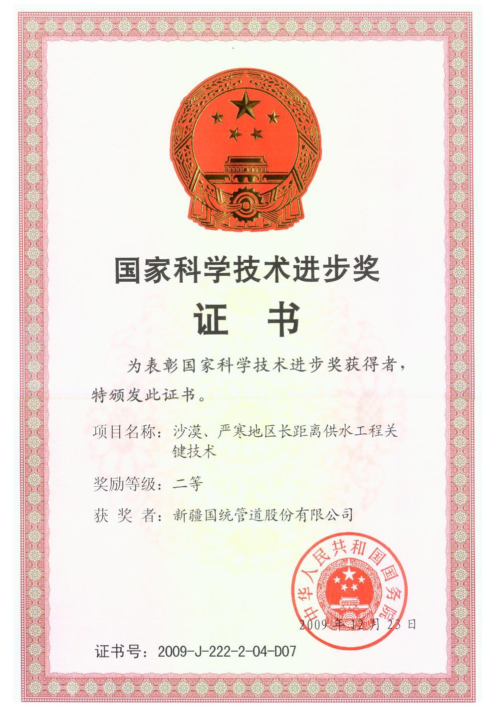 國(guó)家科學(xué)技術(shù)進(jìn)步獎(jiǎng)證書(shū)